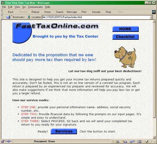 Here is a view of another client's home page which incorporated a fully programmed application to take tax info over the Web. We gather the full range of IRS Form 1040 data and send it to the tax man for processing. The programming is transparent and performed entirely in the background, making things easier for taxpayers! | Home |